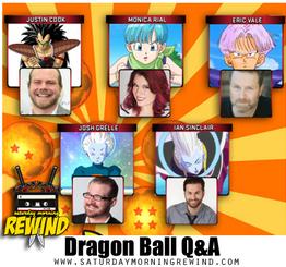 Dragon Ball Actors Q&A Panel featuring: Justin Cook (Raditz), Monica Rial (Bulma), Eric Vale (Trunks), Ian Sinclair (Whis), and Josh Grelle (Demigra) ... and hosted by Tim Nydell (of Saturday Morning Rewind).